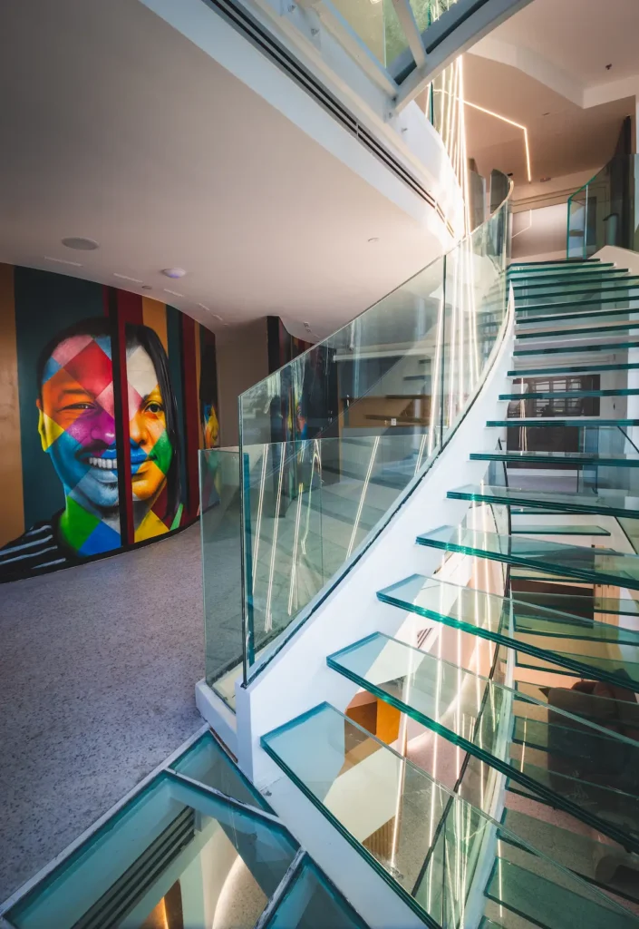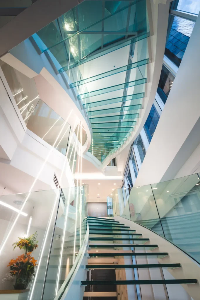 Este projeto exemplar, incorporando degraus multilaminados de 30mm com película estrutural SentryGlas® e um guarda corpo de vidro de 20mm, reflete a sinergia entre nossa expertise em vidro e a visão arquitetônica lendária do escritório. Cada curva e cada linha ecoam a inovação, segurança e a estética arrojada que a R2 Vidros leva para o espaço moderno.